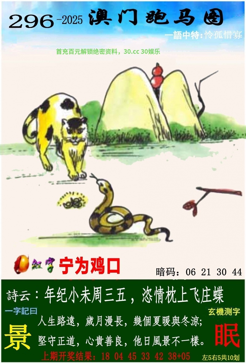 | 296期一字記曰:【景】 人生路运,岁月漫长,几个夏暖与冬凉。坚守正道,心贵善良,他日风景不一样。《眠》 解:他日风景不一样:他日解兔龙蛇马羊猴。 生肖:兔龙蛇马羊猴 |
