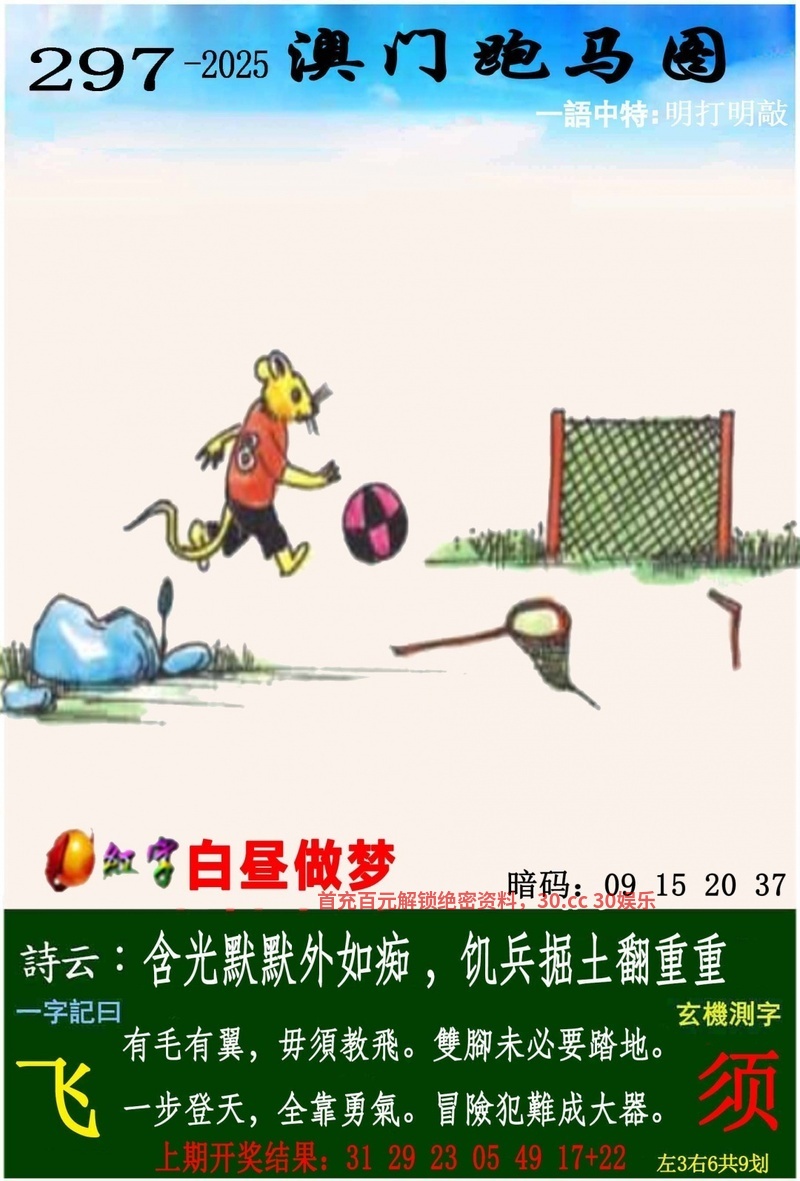| 297期一字記曰:【飞】 有毛有翼,毋须教飞,双脚未必要踏地。一步登天,全靠勇气,冒险犯难成大器。《须》 解:双脚未必要踏地:要踏地解地肖蛇鸡狗虎鼠羊。 生肖:蛇鸡狗虎鼠羊 |