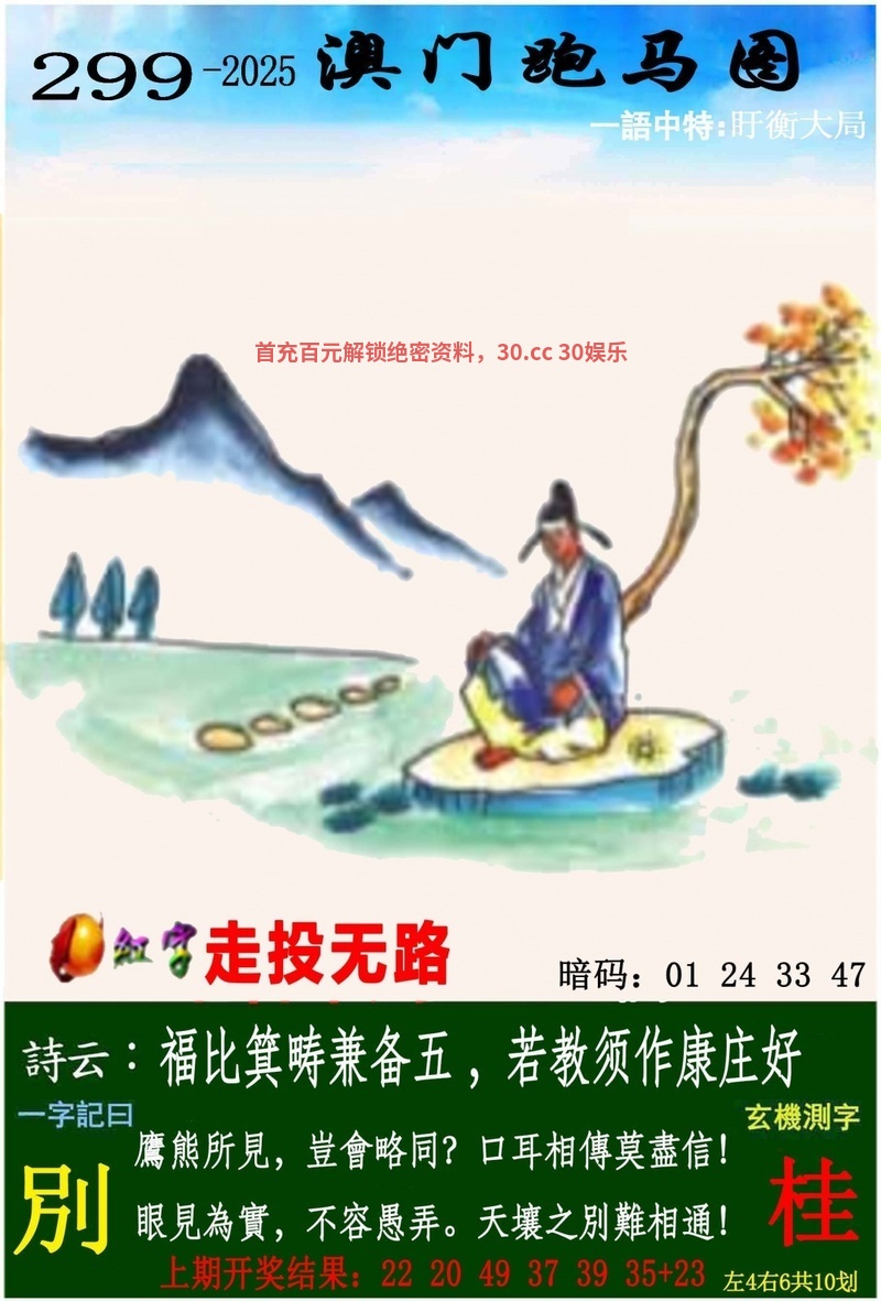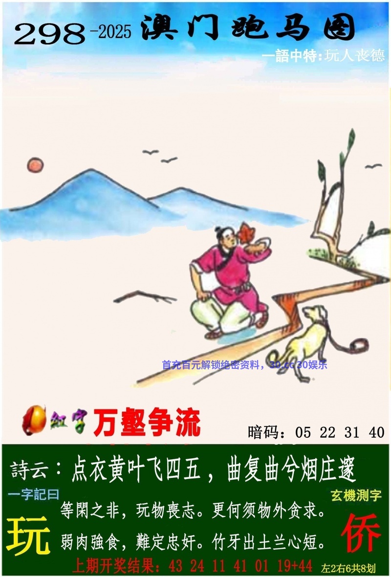 | 298期一字記曰:【玩】 等闲之非,玩物丧志,更何须物外贪求。弱肉强食,难定忠奸,竹牙出土兰心短。《侨》 解:竹牙出土兰心短解兔鸡龙虎羊猪。 生肖:兔鸡龙虎羊猪 |